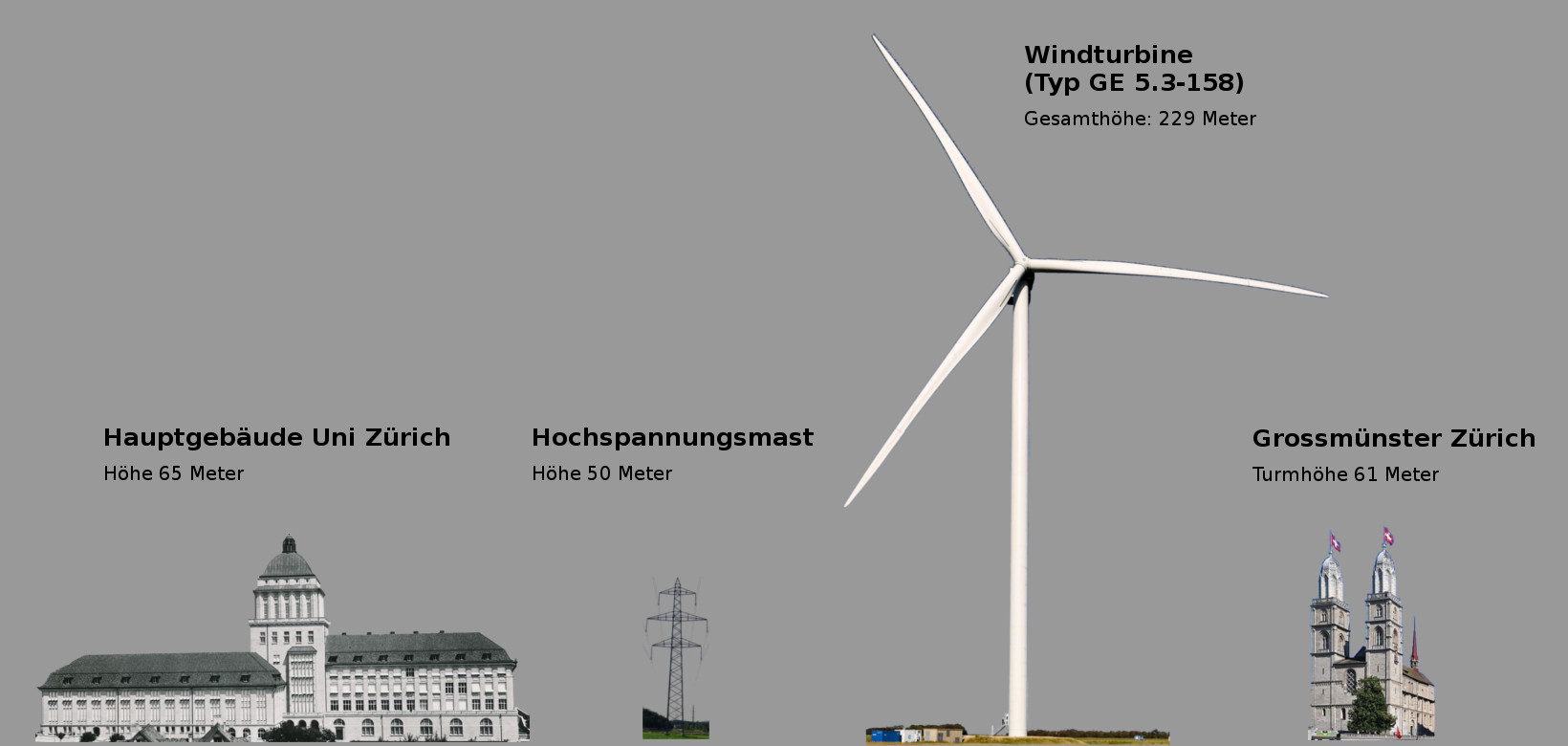 Heutige Windturbinen erreichen Höhen von 230 Metern und überragen damit alle heute in der Schweiz existierenden Bauten. Die meisten Hochspannungsmasten sind weniger als 50 Meter, Seilbahnstützen weniger als 100 Meter hoch.
